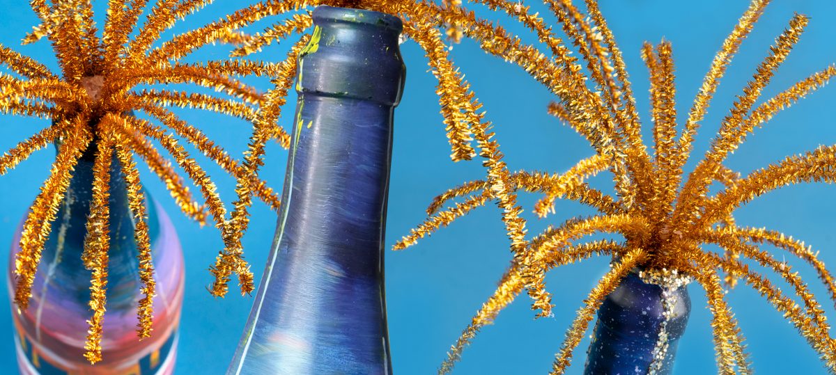 Add a trail of glue going up the bottle to show the train of the fireworks going up into the air, then sprinkle with glitter. Finally, bend each pipe cleaner, placing each bent portion in the top of the bottle so the bent ends stand out like fireworks. Use craft glue to keep in place.
