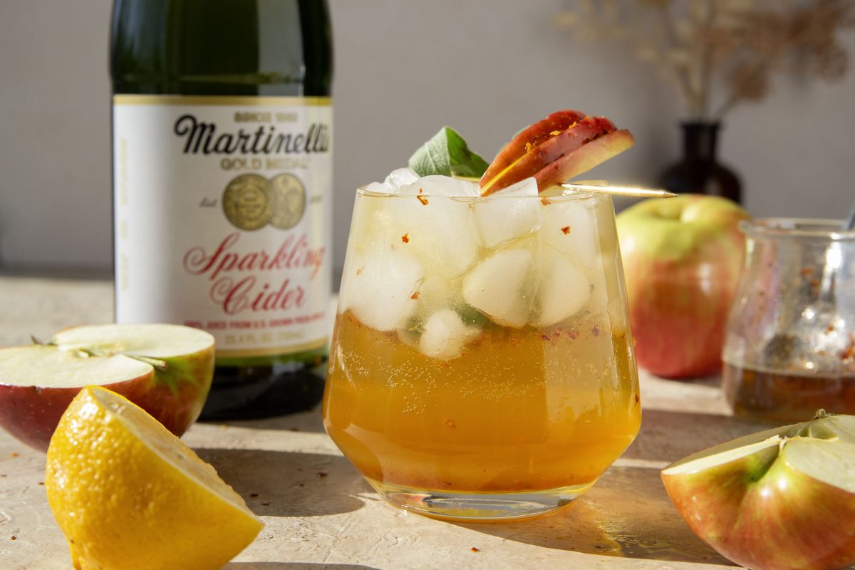 - Fill the glass with ice and top with lemon juice, bourbon and Martinelli’s Sparkling Cider